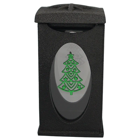 - Elegancki i ciężki znicz o klasycznym kształcie „domek”, wykonany z połączenia żywicy i kamienia. Centralną część zdobi aplikacja w kształcie zielonej choinki, nadająca całości świąteczny, zimowy charakter.