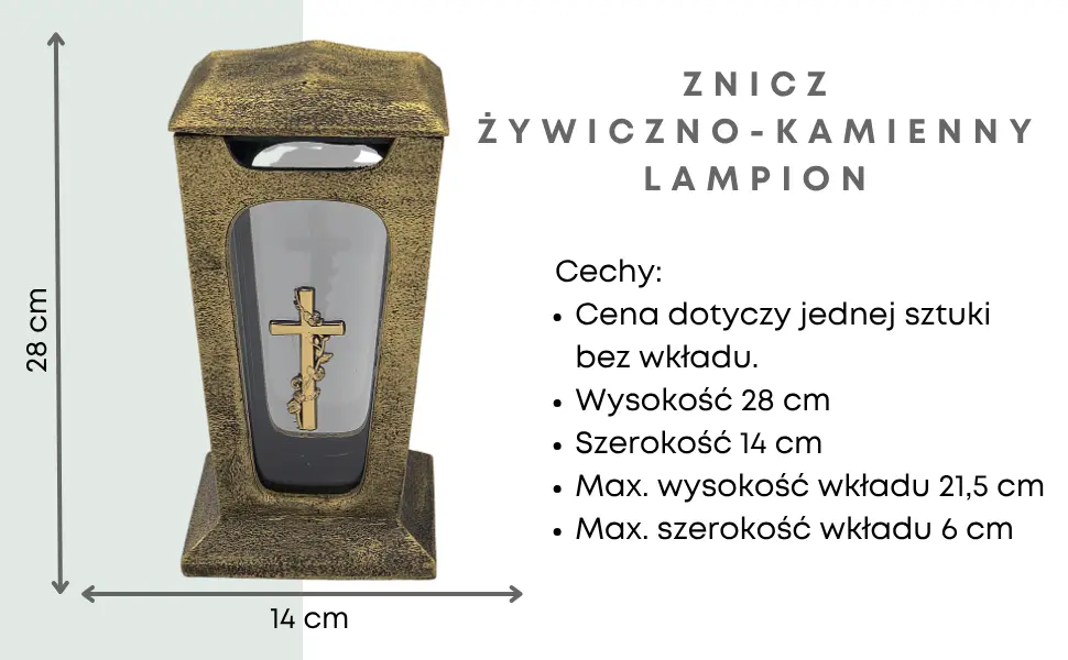 Znicz w formie klasycznego lampionu, wyróżniający się trwałością i eleganckim wykonaniem. Jego stabilna podstawa oraz mieszanka żywicy z kamieniem gwarantują odporność na mróz, deszcz i słońce.