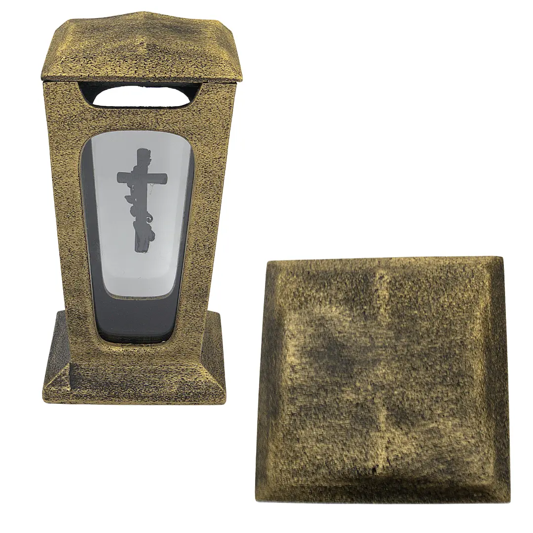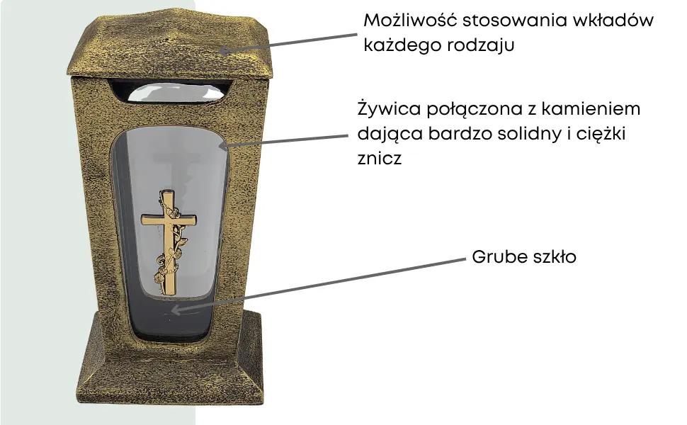 Stylowy znicz nagrobny o geometrycznej formie, wykonany z połączenia kamienia i żywicy, z dekoracyjną szybą i złotym krzyżem. Solidna konstrukcja, eleganckie wykończenie i uniwersalny design sprawiają, że model ten doskonale prezentuje się na każdym nagrobku – przez cały rok.