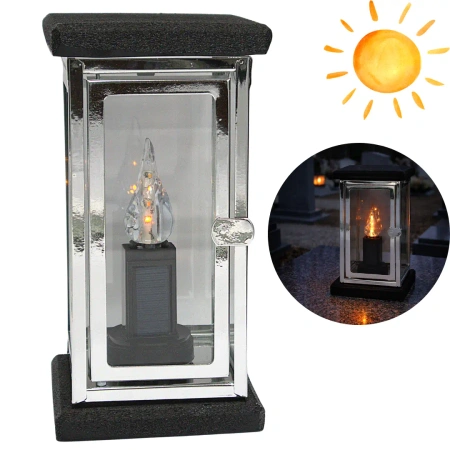 Ciężki i solidny znicz z metalowymi drzwiczkami oraz żywiczną konstrukcją. Otwierana kapliczka z szybami wsuwanymi w prowadnice – co eliminuje ryzyko odklejania się szkła. Srebrne wykończenie dodaje nowoczesnej elegancji. Pasuje do wszystkich rodzajów wkładów – zarówno LED, jak i tradycyjnych.