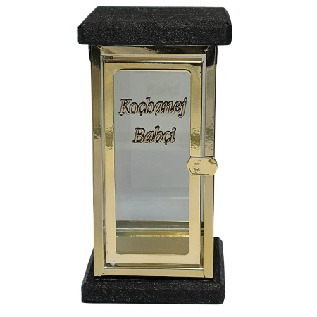 Solidny znicz w formie zamykanej kapliczki z metalowymi drzwiczkami i szybkami zabezpieczonymi w ramie. Front zdobi dedykacja „Kochanej Babci”, co czyni znicz wyjątkową formą pamięci i szacunku. Konstrukcja łączy metal ze stabilną żywiczną podstawą i pokrywą, co zapewnia trwałość i odporność na warunki atmosferyczne. Wkład montowany jest wewnątrz za pomocą otwieranych drzwiczek, co ułatwia użytkowanie.